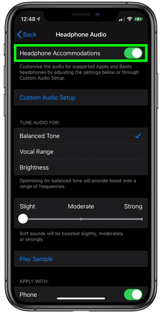 To activate headphone accommodation feature, go to Settings > Accessibility > Audio/Visual > Headphone Accommodations. Here, turn on the switch for the headphone accommodation option.