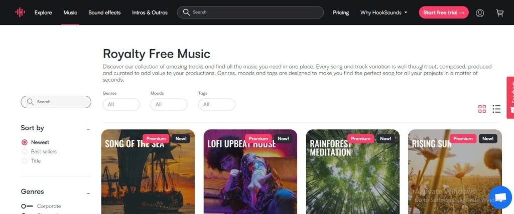 HookSounds prides itself on providing unique, high-quality music tracks that are carefully curated. And composed by a team of hand-picked artists from around the world. The site’s focus on originality ensures that you’ll find music that’s distinct from the generic, cookie-cutter tracks that you might find on other music sites. Moreover, you can find a good amount of Lullaby for kids as well.