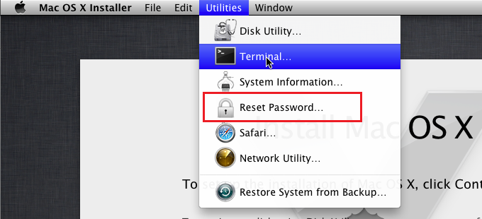 3. In the Utilities menu on the top, select Terminal and type: resetpassword and hit return.