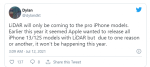DylanDKT, a less trustworthy developer and leaker of Tech upgrades, posted about the new iPhone 13 and iPhone 13 mini on his Twitter handle. He believes that Apple will exclude the 13 generations of iPhone models from the LiDAR feature. The company initially planned to include this unique feature in all of its models, but it looks like it changed its mind. As per Dylan, now only iPhone Pro models will have the LiDAR feature this year.