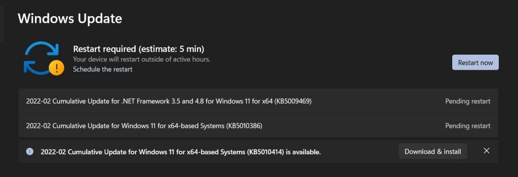 - When completed, press the Restart Now button to finish the final steps of the Windows Update download. You can also schedule the restart for a later time.
