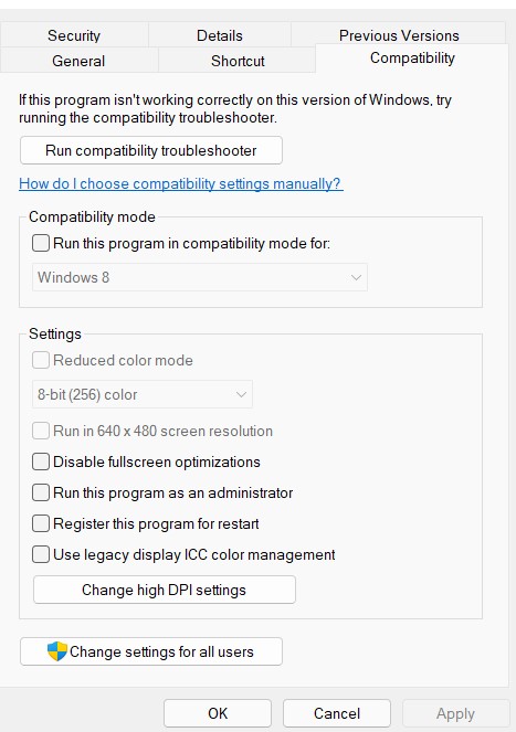 - In the Properties Window, go to the Compatibility tab and then choose the Run this program as an administrator option.