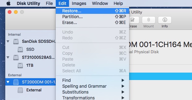 - Now click on the newly formatted USB/external drive and go to the edit menu on top menu bar and select Restore if you are doing it on OS X El Capitan or macOS Sierra.