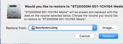 Restore Image from Disk Utility in El Capitan to make bootable USB - In the new window select the image BaseSystem.dmg under Restore from and click “Restore”.This will make USB/external drive bootable installer.