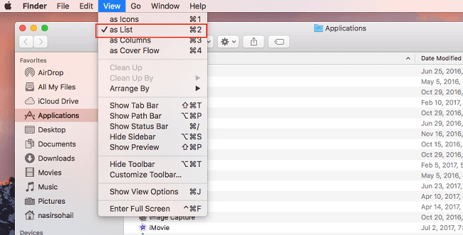 - You need to first enable list view option by clicking on “View” menu at the top and selecting “as list” or simply press “Command+2” keys.