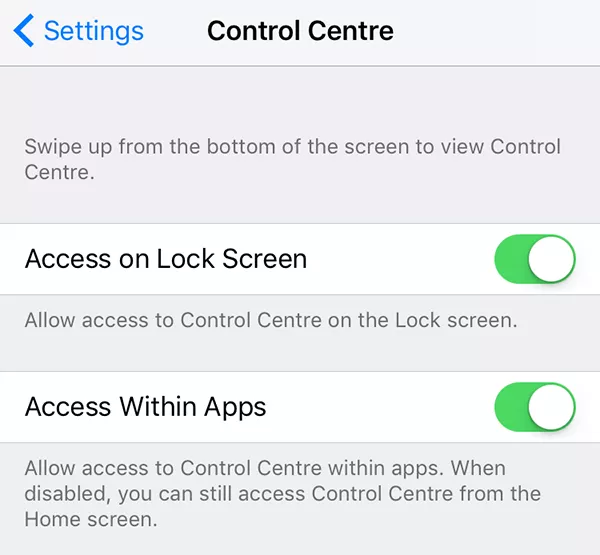 Go to the Control Center settings and move the toggle for Access Within Apps to the ON position. Now go back and see if you can access the Control Center from within the app.