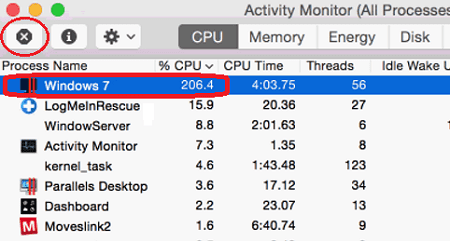 - Now the one eating CPU the most will show up on top. Click to select the top most process and click “x ” button at the top left corner to quit that process.