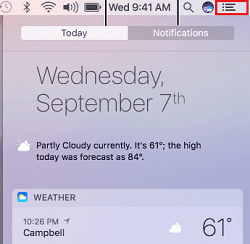 Notification Center can be accessed by just clicking the three parallel lines next to spotlight at the top-right corner of your screen or by swiping in from the right side of your Mac’s trackpad with two fingers.