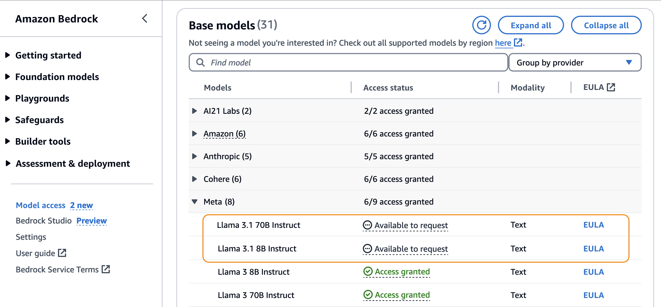 Llama 3.1 8B and 70B models from Meta are now generally available, and the Llama 405B model is in preview in Amazon Bedrock in the US West (Oregon) Region. To request access to the preview of Llama 3.1 405B, users should contact their AWS account team or submit a support ticket. Check the full Region list for future updates.
