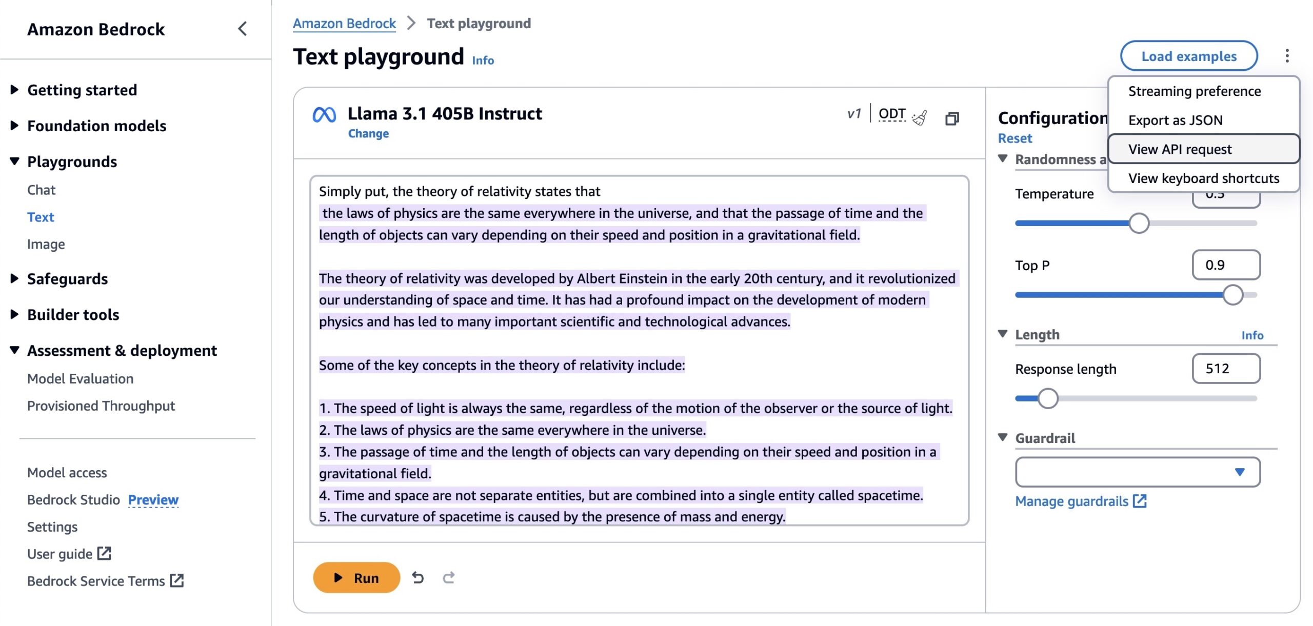 Amazon Bedrock provides robust features for building secure and reliable generative AI applications. Users can take advantage of Llama 3.1’s responsible AI capabilities, combined with data governance and model evaluation features, to ensure safe and ethical AI interactions.