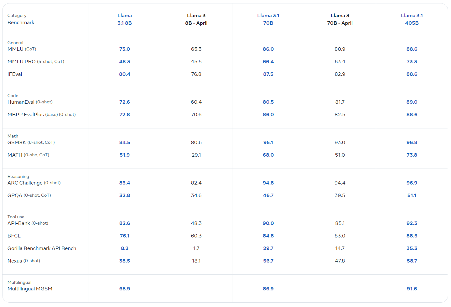 Meta has rigorously evaluated the Llama 3.1 models across more than 150 benchmark datasets, covering a wide range of languages and extensive human evaluations. The performance results show that Llama 3.1 outperforms the previous Llama 3 models in every major benchmarking category.