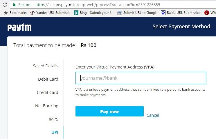 2. Type your VPA (Virtual Payment Address), For example, yourname@bankname or mobilenumber@upi and click continue.