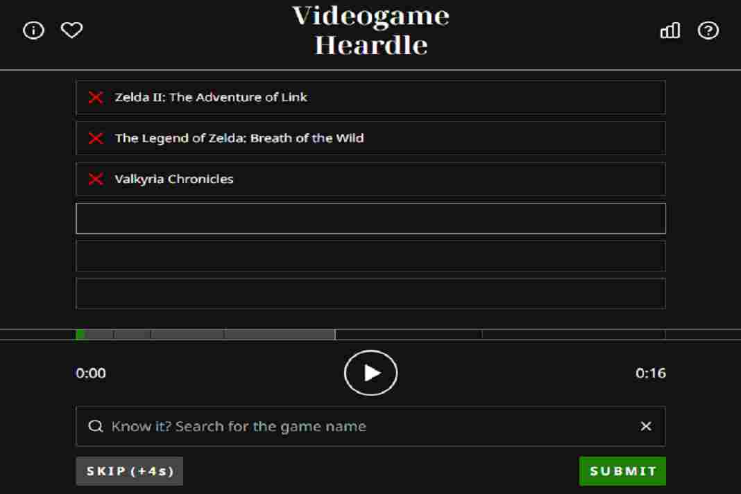 Videogame Heardle is a musical take on the internet’s sensation Wordle. It requires the players to guess the videogame by its intro sound. To guess the soundtrack, the player is given 6 chances. It tests the player’s knowledge about video games.