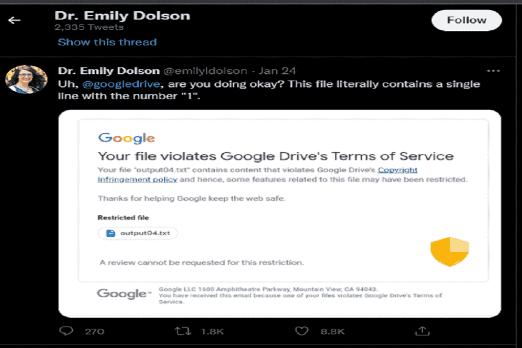 Apparently, there is something wrong with the Google drive that it flagged folder containing only “1” as a copyright infringement. Fortunately, the drive team took note of the issue and responded to Emily Dolson on Twitter.