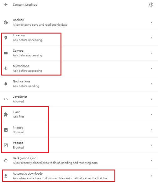 - You can choose from a variety of options like Cookies, location services, access to camera and microphone, JavaScript, Notification, Flash Content, Images, Pop Ups, Automatic Downloads, Zoom Level.